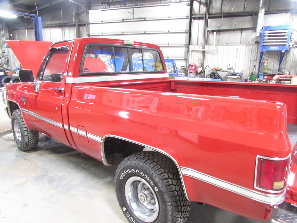 1987 Silverado 4X4 Short box. This truck was owned by the same man for 38 years. 350 - Auto, bright red with red cloth interior, 4 new tires on 8" Rally rims, new dual exhaust sounds mellow. The paint is water sanded and buffed to a nice luster. The underside is very clean and rust free as the pictures show. This truck was painted, as near as we can trace back, approximately 30 years ago and then stored in an enclosed trailer. Miles are just over 100,000. Lock out hubs work fine. There is much more. Call for more info. This good looking Square Body can be purchased for $39500.00. Phone 715-284-4525.